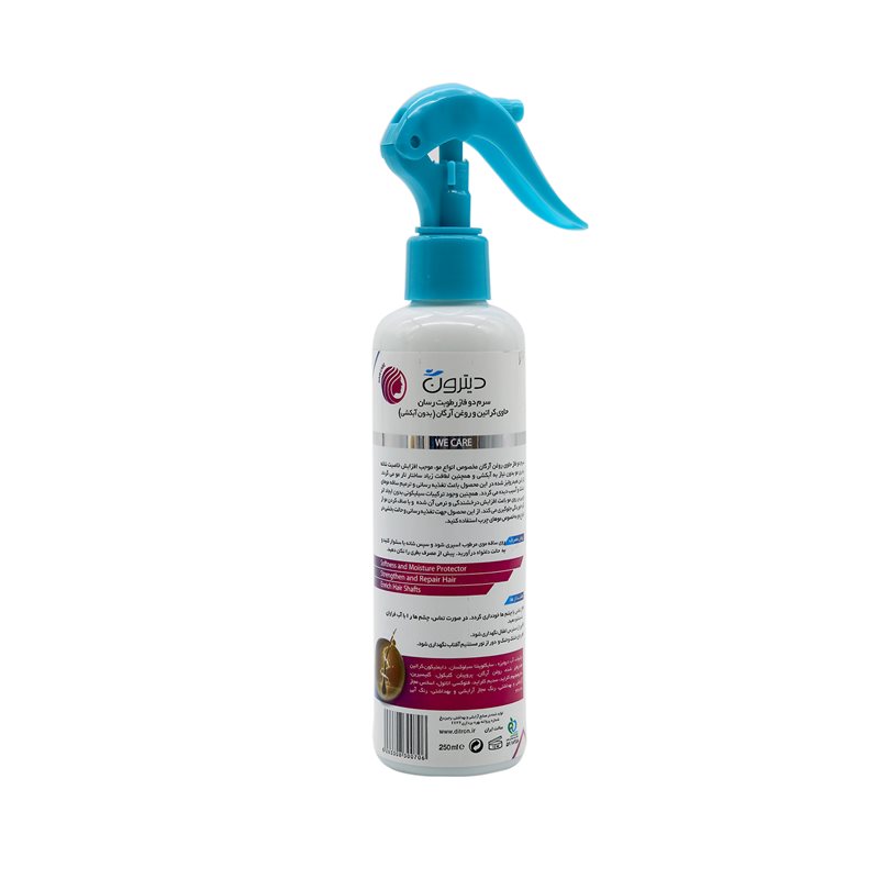 سرم دو فاز رطوبت رسان مو دیترون همان محصولی است که شما برای داشتن موهایی سالم و زیبا به آن نیاز دارید. این سرم حاوی روغن آرگان و کراتین است. روغن آرگان بافت مو را نرم و مرطوب می کند و باعث افزایش خاصیت شانه پذیری موها می شود. کراتین هیدرولیز شده در این محصول ساقه موهای خشک و آسیب دیده را تغذیه و ترمیم می کند. همچنین وجود ترکیبات سیلیکونی موجود در این اسپری بدون ایجاد اثر چربی بر روی مو، باعث افزایش درخشندگی و نرمی موها شده و با صاف کردن مو از گره خوردن آن جلوگیری می کند. این محصول برای انواع مو حتی موهای چرب هم مناسب می باشد و دارای اپلیکاتور اسپری ای است که به راحتی می توانید آن را روی موهای خود اسپری کنید.