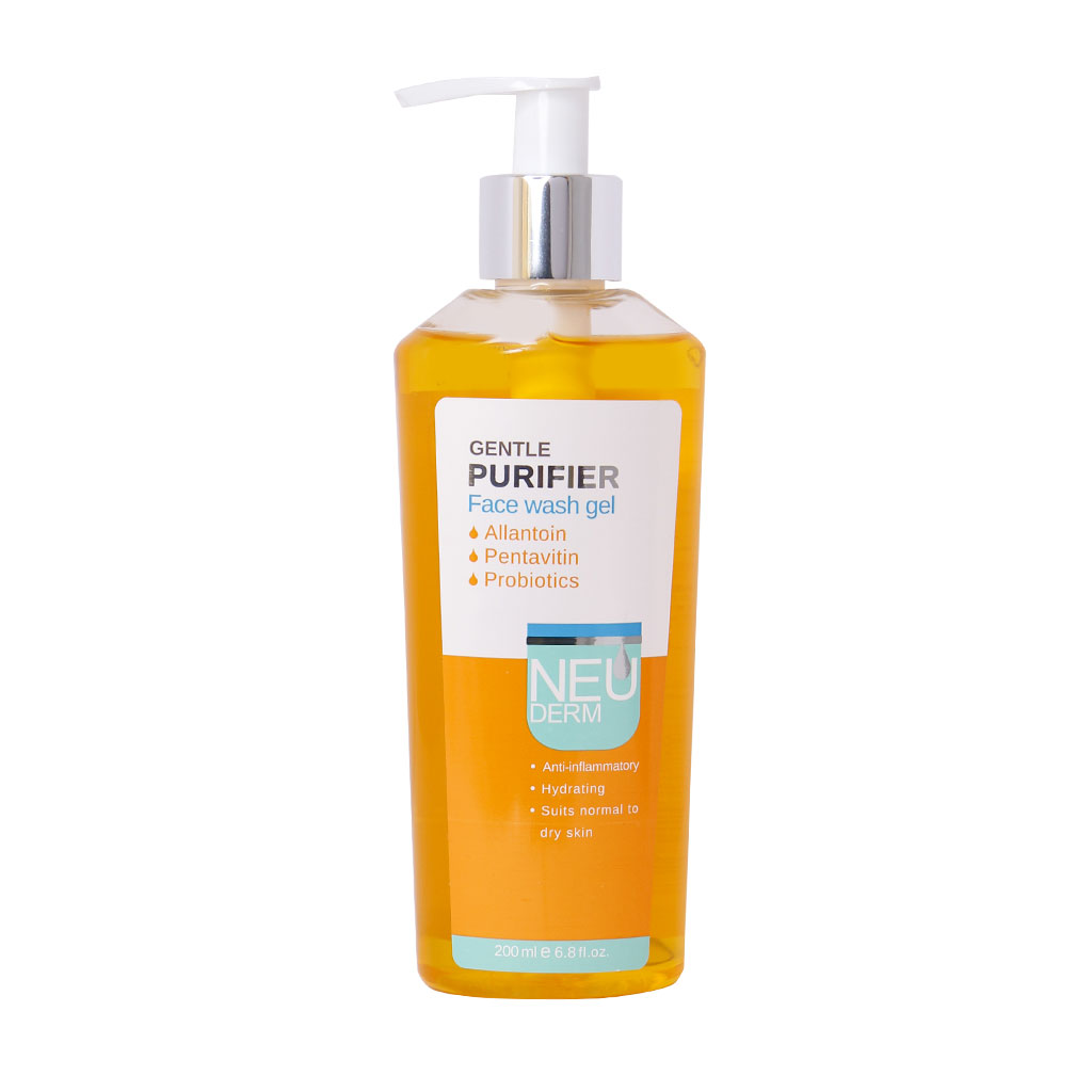 مقداری از ژل شوینده صورت پوست خشک و نرمال نئودرم را بر روی پوست مرطوب صورت، به آرامی ماساژ دهید و سپس آبکشی نمایید.